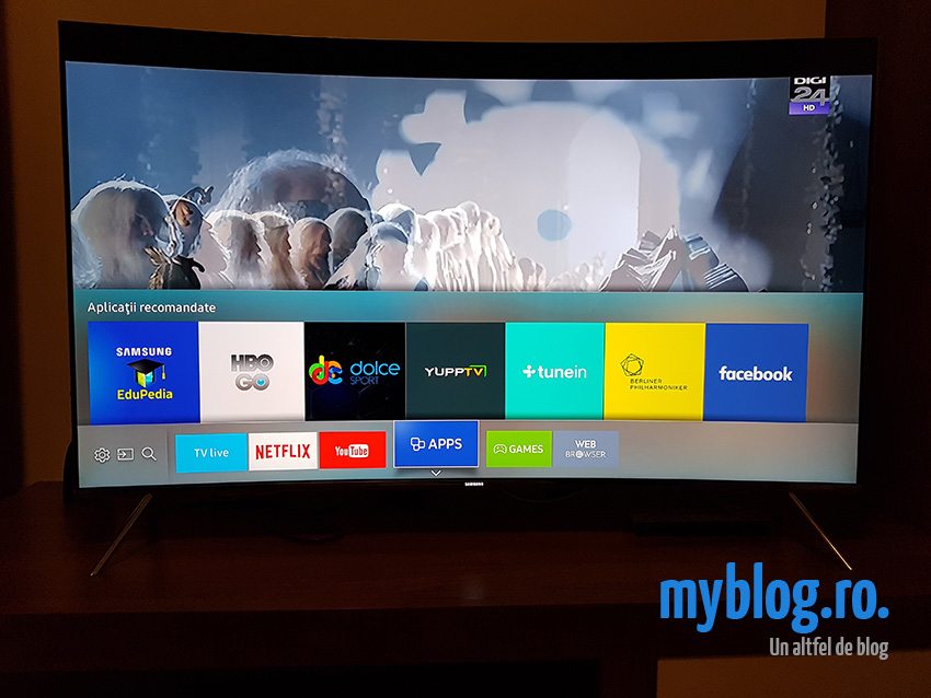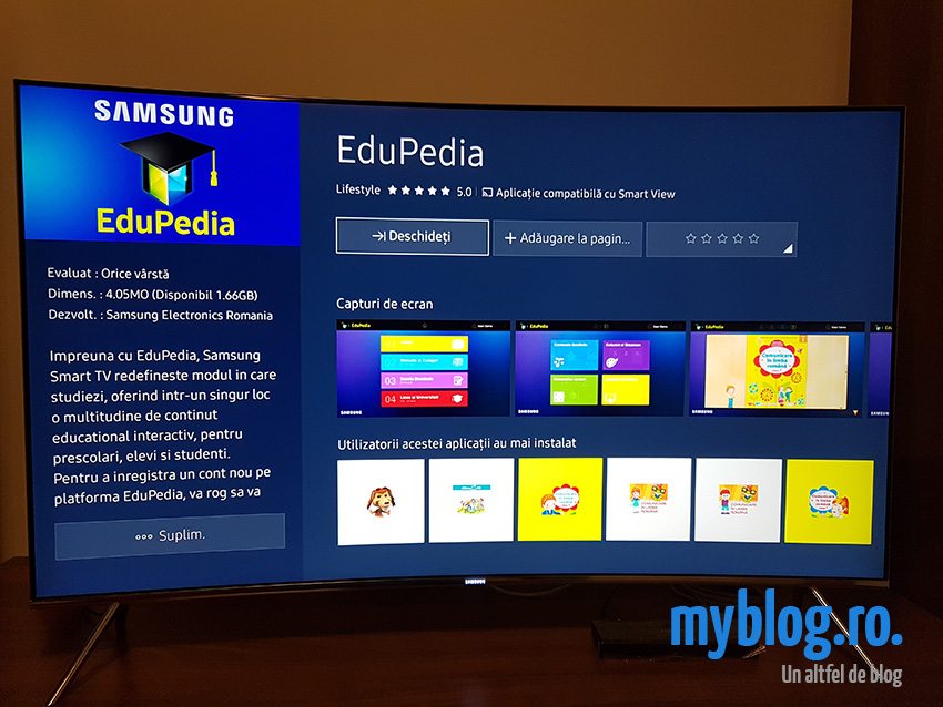 Libraria de aplicatii este destul de vasta, si ofera o gama larga de aplicatii optimizate pentru Samsung Smart TV, dintre care amintim Netflix, HBOGO, Plex, IPTV si multe altele. Televizorul are preinstalata si aplicatia Samsung EduPedia care ofera intr-un singur loc o multitudine de continut educativ interactiv, pentru prescolari, elevi si studenti.